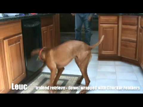 I started with three pupils. A six year old Vizsla Female, (Tessa) A 3 1/2 year old Vizsla Male (Hank) and an 18 month old Vizsla Male, (Leuc). The first observation is the males seem a little slower to "get it", but then the sampling is very small so take that for what it's worth. Of the two males, the one is to the point of almost picking up the dowel from the floor - he is the slowest, but also the least food motivated. I've found he takes the treat - but by giving loads of praise at milestone moments it helps set the behavior better in his mind.